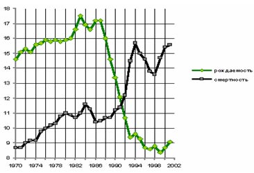 Из графика видно, что в среднем темпы роста смертности превышают темпы роста рождаемости с 1970 г по 1984 г. В 1985 г, как уже было сказано, началась антиалкогольная кампания, эффект от которой оказался исчерпанным уже к 1987 году, что также хорошо видно на графике. После резкого снижения смертности, рост смертности, начиная с 1988 года, вновь возобновляется.