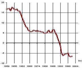 Действительно, на первый взгляд из графика видно, что этот показатель, несмотря на тенденцию к снижению, тем не менее, оставался положительным в течение всего советского периода. Однако, наиболее точным показателем, характеризующим воспроизводство населения, является отнюдь не естественный прирост населения, а среднее число родившихся в данном календарном году девочек (на одну женщину), доживающих до среднего возраста рождения детей (при сохранении возрастных коэффициентов смертности на уровне данного календарного года). Именно этот показатель, называемый нетто-коэффициентом воспроизводства, используется демографами для оценки долгосрочных тенденций воспроизводства населения. В теории, для устойчивого воспроизводства населения нетто-коэффициент должен равняться как минимум единице, то есть на каждую женщину должна родится минимум одна девочка и дожить до репродуктивного возраста. Место умершей матери должна, в свое время, занять дочь и также родить как минимум одну девочку. Но это только в теории. Поскольку на практике не каждая женщина, даже дожившая до репродуктивного возраста, имеет детей, то нетто-коэффициент должен быть не просто равен единице, а превышать единицу. Если же коэффициент падает ниже единицы и остается на таком уровне, то это делает демографическую катастрофу неминуемой. Так вот, в России нетто-коэффициент упал ниже единицы еще в 1965 году (0,98), стабильно понижался последующие пятнадцать лет, достигнув в 1980 году уровня 0,88. С 1980 г. по 1985 г. коэффициент продолжал оставаться меньше единицы. Как читатель наверное уже догадывается, во время антиалкогольной кампании нетто-коэффициент поднялся выше единицы, но вновь начинает резко падать уже к 1988 году (до уровня 0,95)! То есть опять подтверждается тот факт, что борьба с пьянством запретительными мерами без выявления глубинных причин проблемы, может иметь лишь кратковременный эффект, после чего быстро нарастают отрицательные тенденции.